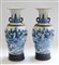 Coppia di vasi biansati a balaustro in porcellana bianca e blu su fondo craquel