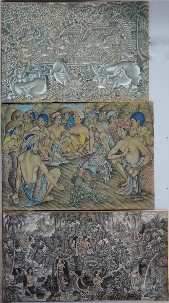 Lotto composto da tre dipinti balinesi di soggetti e misure diverse (difetti)