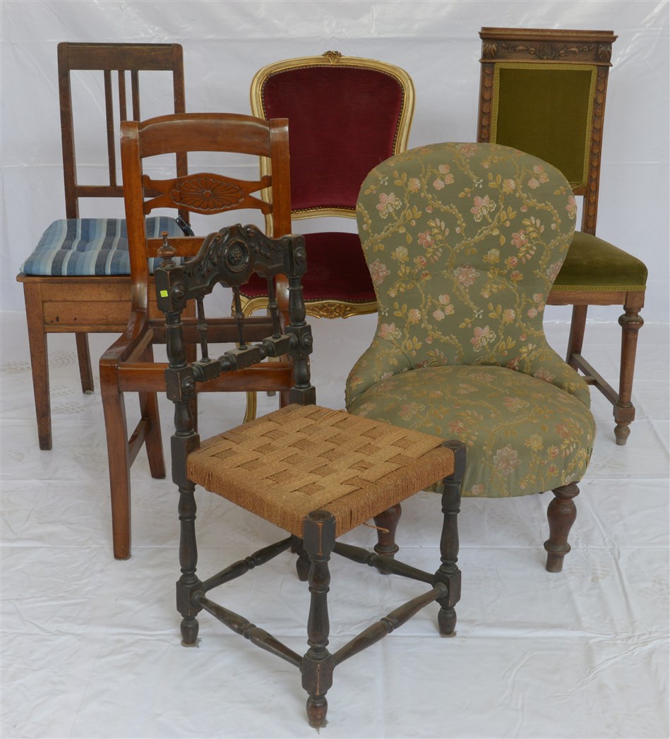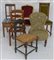 Lotto composto da quattro sedie diverse, una comoda ed una poltroncina da camera imbottita. Sec. XIX e XX (difetti e mancanze)