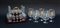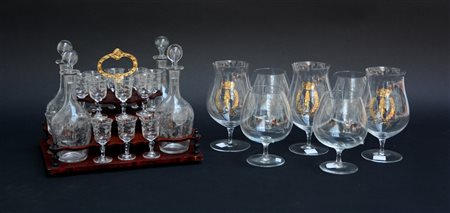 Lotto composto da un servizio da liquore in vetro inciso a motivi floreali con supporti in legno (scompleto) e sette bicchieri da cognac (difetti e mancanze)