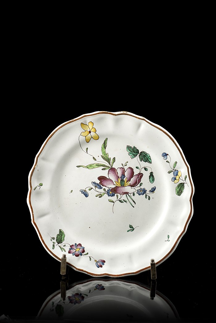 Manifattura di Pasquale Rubati, Milano, 1770/80. Piatto polilobato in maiolica con bordo profilato in rosso bruno e decoro a fiori recisi in ricca policromia a piccolo fuoco detto 'a uso di Strasburgo' (d. cm 20) (sbeccature)