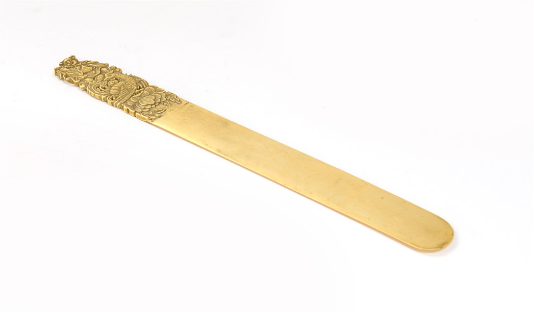 Tagliacarte in avorio con presa incisa e traforata a figura e fenice. Cina, sec
