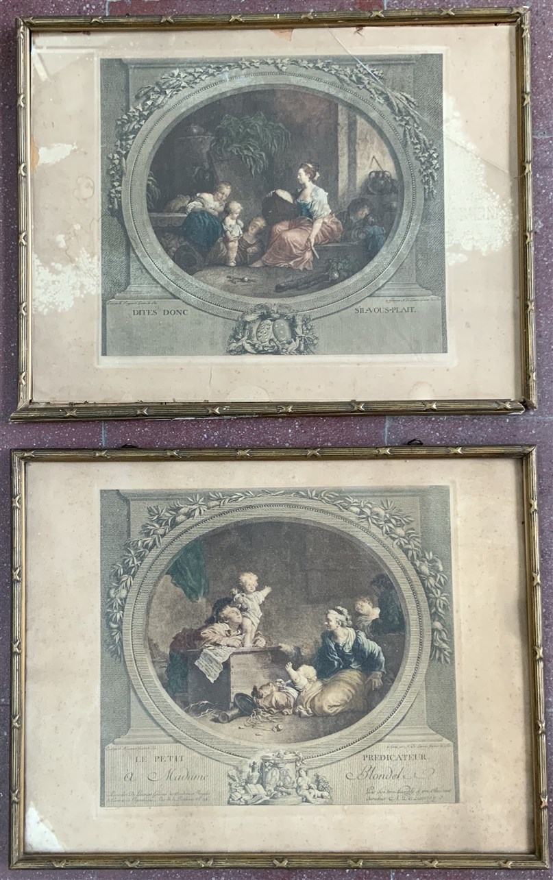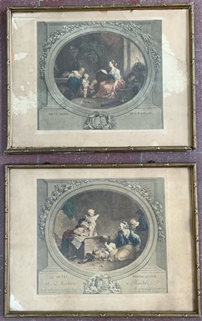 Coppia di stampe acquarellate raffiguranti scene familiari con bambini del sec.