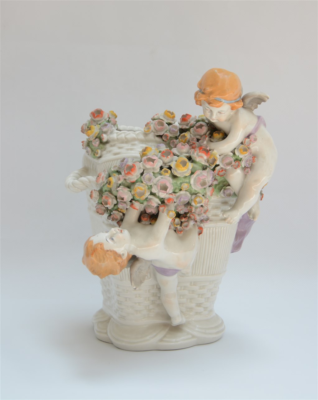 Manifattura cecoslovacca Anphora, vaso in porcellana a forma di canestra biansata con amorini a tuttotondo e fiori policromi (h cm 32) (lievi difetti)