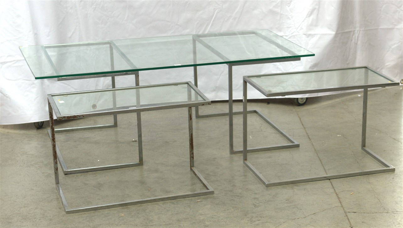 Lotto composto da un tavolo basso con piano rettangolare in cristalo molato e struttura in profilato metallico cromato, unito a due tavolini di analoga fattura. Italia, anni '70. (difetti)