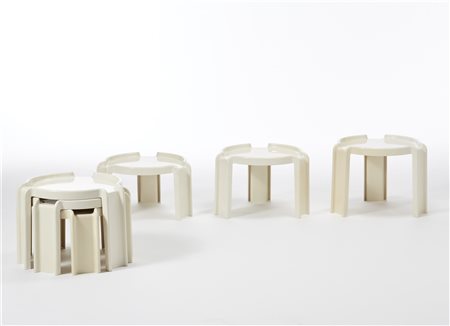 Lotto di due set di tre tavolini impilabili modello "4905-6-7". Produzione Kartell, Milano, 1968. Abs bianco. Marcati sotto la seduta. Segnalazione al Compasso d'Oro del 1970. (h cm 37,33,29 e d cm 43) (lievi difetti)