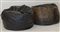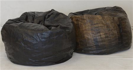 Lotto di due poltrone a sacco con involucro in similpelle sintetica nera e marrone contenente perle in polistirolo. Italia, secolo XX. (difetti)