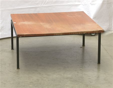 Tavolino da salotto quadrato con piano in legno impiallacciato e telatio in metallo verniciato nero. Italia, anni '60. (cm 80x38x79) (gravi difetti)