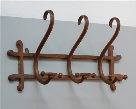 Appendiabiti da parete in faggio curvato al vapore. Vienna, prima metà secolo XX. Marcato ad inchiostro "Thonet". (cm 75x43x21)