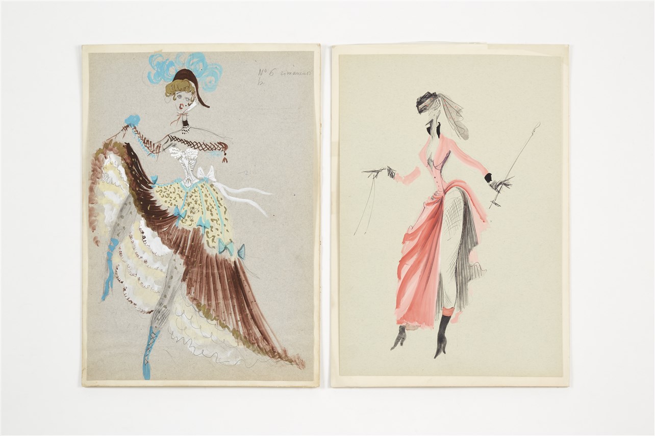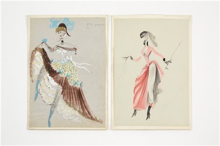 Pair of sketches for theatrical costumes. Rome, 1954. Mixed technique on paper glued on cardboard bearing sketches, inscribed and dated on the verso. (45.5x30 cm.) (slight defects)