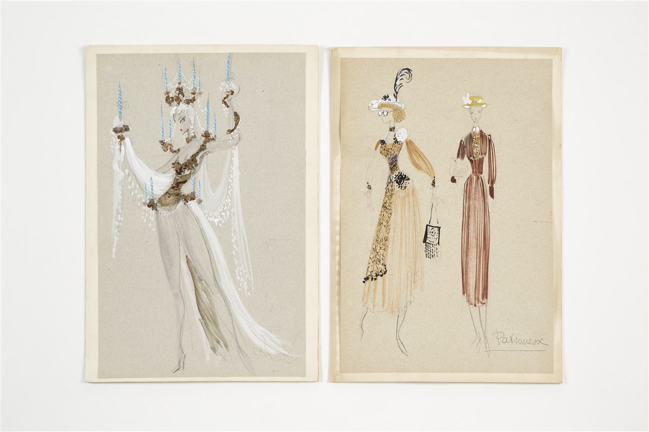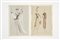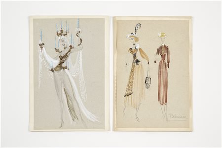 Pair of sketches for theatrical costumes. Rome, 1950s. Mixed technique on paper glued on cardboard bearing sketches and inscribed on the verso. (45.5x30 cm.) (slight defects)