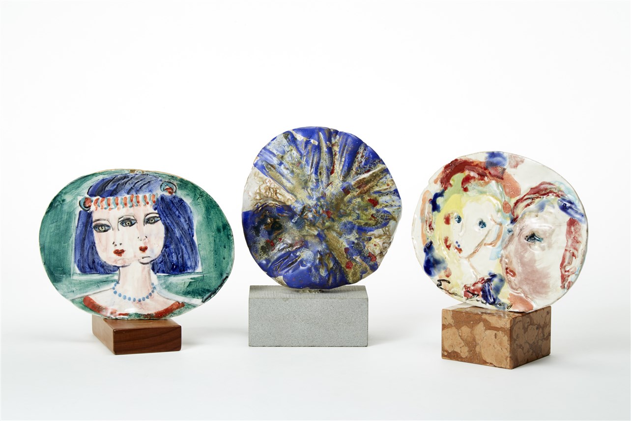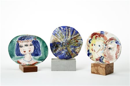 Lotto di tre tondi su basamento in ceramica smaltata in policromia rispettivamente di Bruno Cassinari, Ernesto Treccani e Giuseppe Zanetti. Epoche diverse. Recanti firma degli autori. (Misure diverse) (lievi difetti)