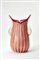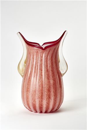 Vaso biansato in vetro sommerso pulegoso lattimo e a macchie rosa con inclusione di foglia d'oro e orlo applicato in vetro rosso. (h cm 35,5)