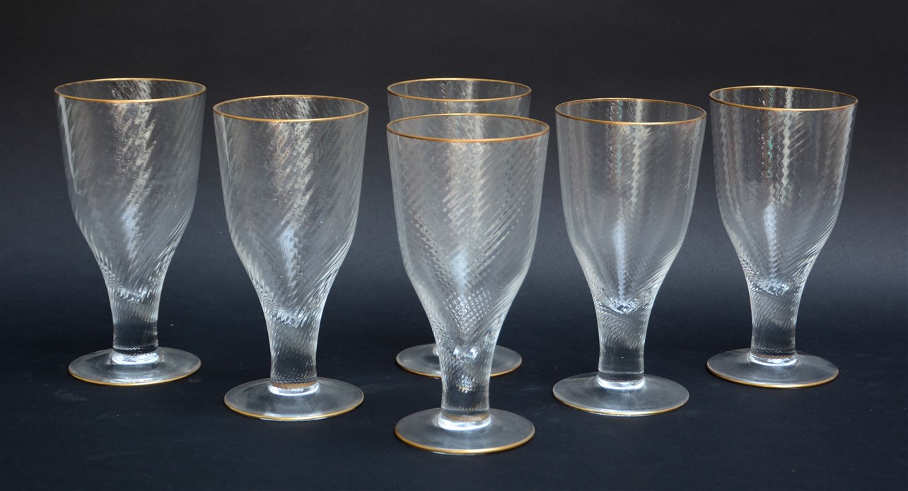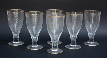 Sei coppe in vetro soffiato incolore a costolature ritorte. Orli dorati. Epoca recente. (h cm 23,5) (lievi difetti)