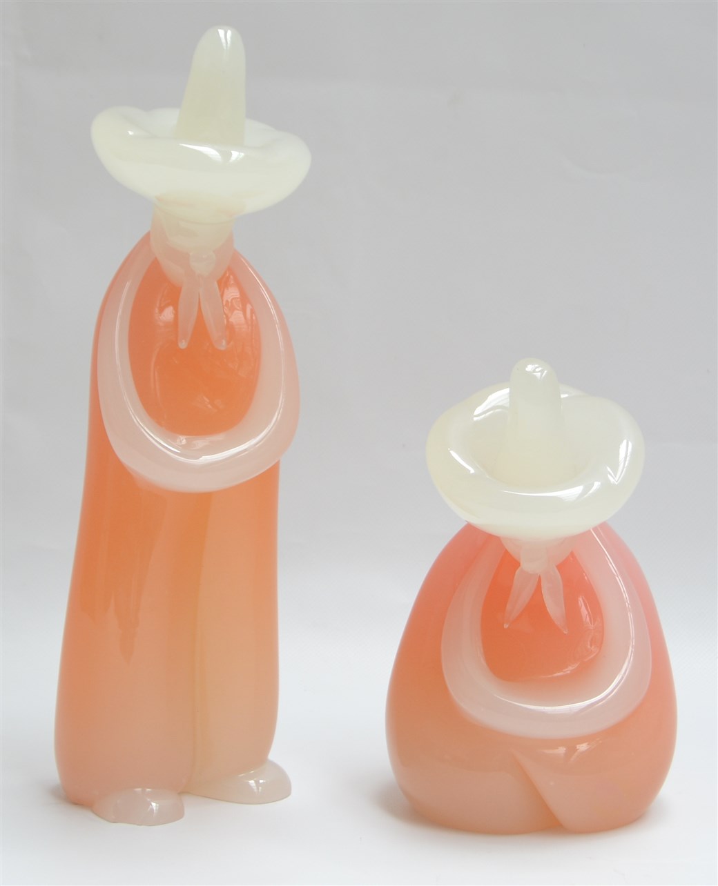 Coppia di sculture in vetro massello opalescente e color albicocca raffiguranti due personaggi messicani. Italia, anni '80/'90. Recanti etichetta "Archimede Seguso"sotto la base. (h max cm 36) (difetti)