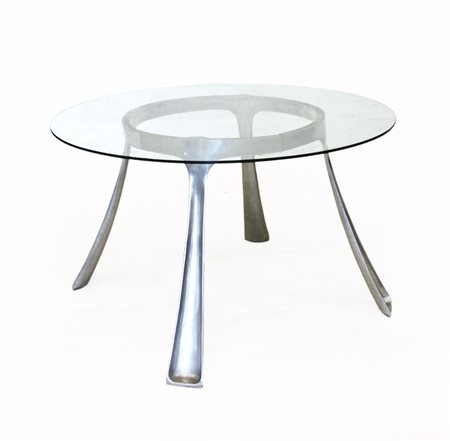 Tavolo con piano cristallo e base in alluminio pressofus. Anni '80/'90. (h cm 80; d cm 124,5) (difetti)