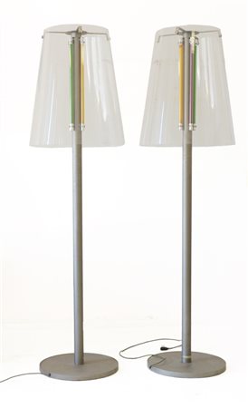 Coppia di lampade da terra a quattro neon tubolari di diverso colore, struttura in metallo verniciato e satinato e paralume in plexiglass. Produzione recente. (h cm 210; d cm 60) (lievi difetti)