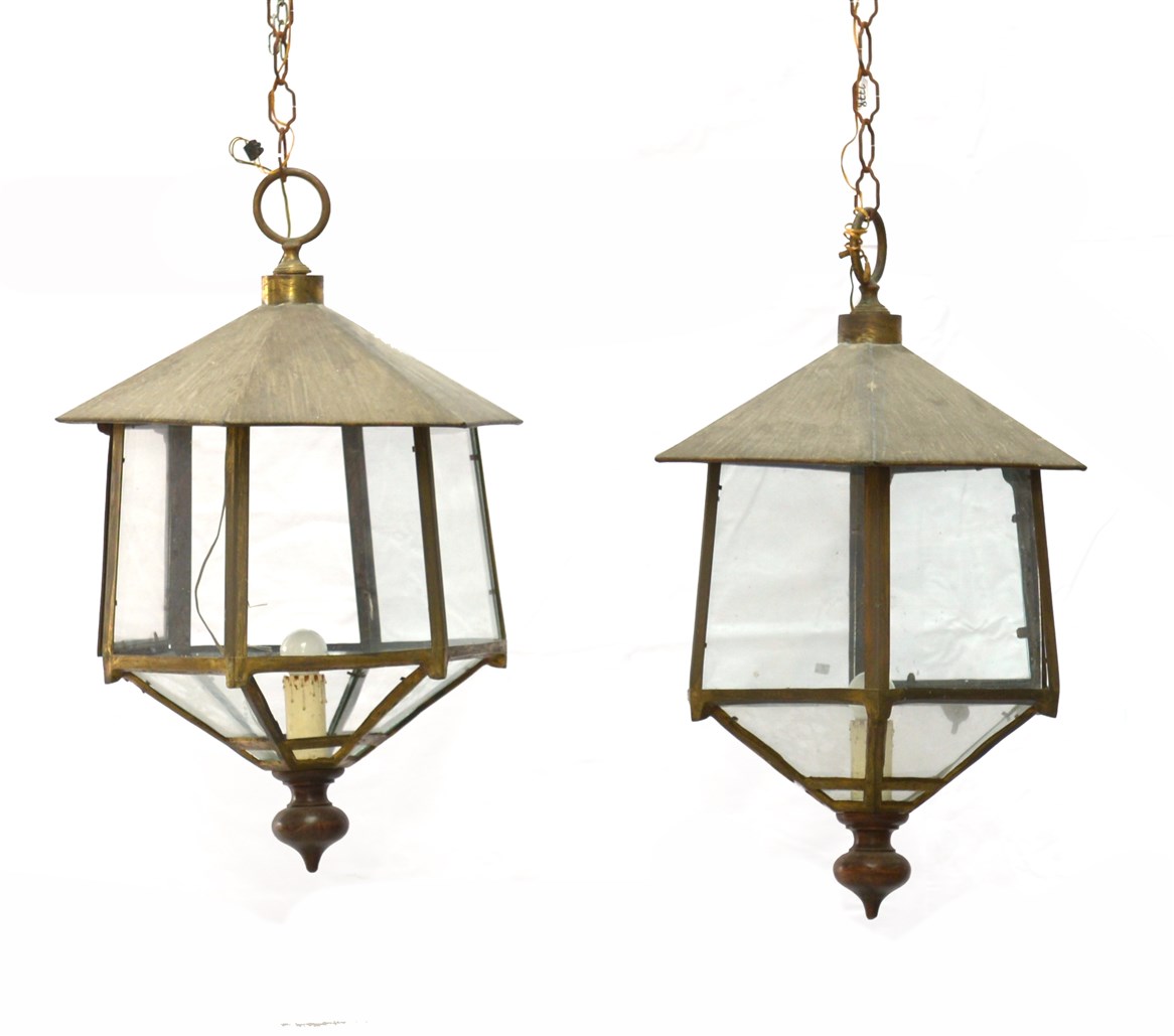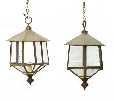 Lotto di due lampadari a lanterna in ottone e vetro. Italia, anni '40. (difetti