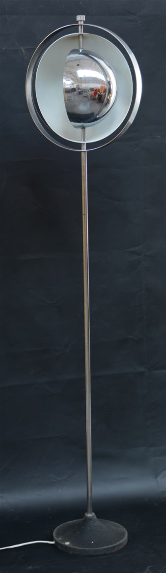 Lampada da terra con base in ghisa, fusto in acciaio e paralume a doppia calotta in alluminio. Italia, anni '70. (h cm 156) (difetti)