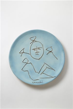 Large ceramic plate glazed in blue and etched with anthropomorphic figures. Manufacture of Ceramiche S. Giorgio, Albisola, 1990. Signed on the bottom and verso. (d 51 cm.)