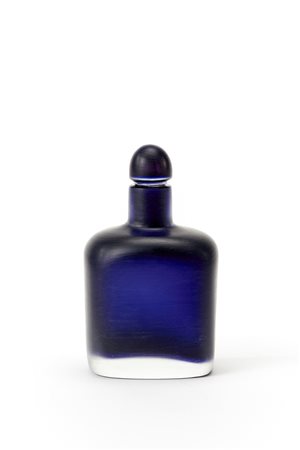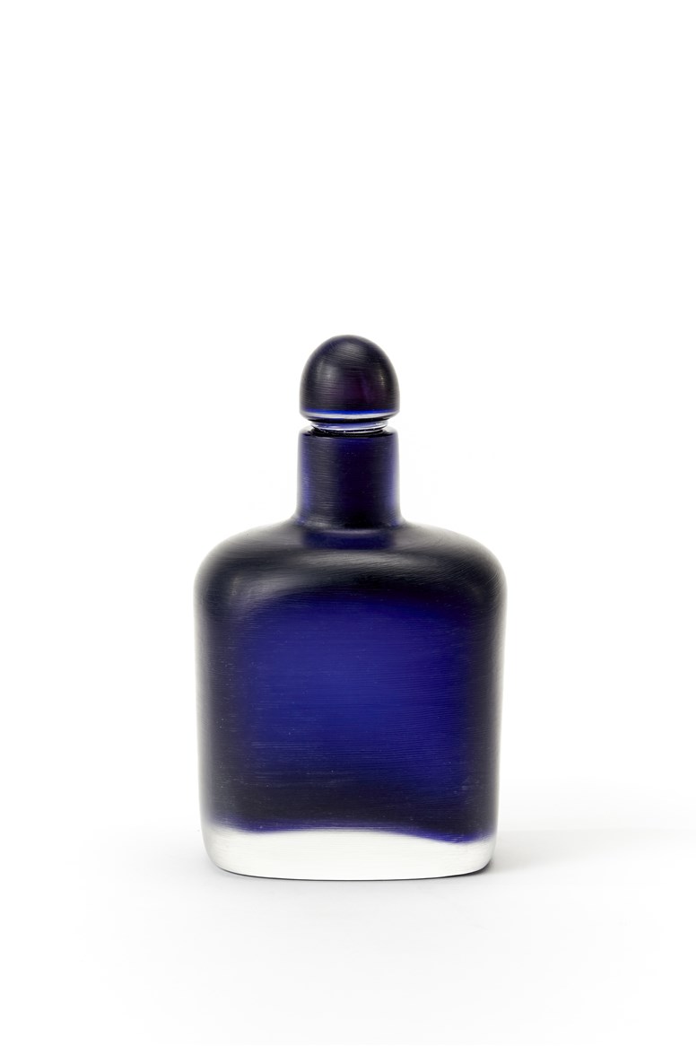 Bottiglia con tappo in vetro sommerso di color ametista scuro, lavorato alla piccola ruota sulla superficie esterna. Anni '70/'80. (h cm 20)