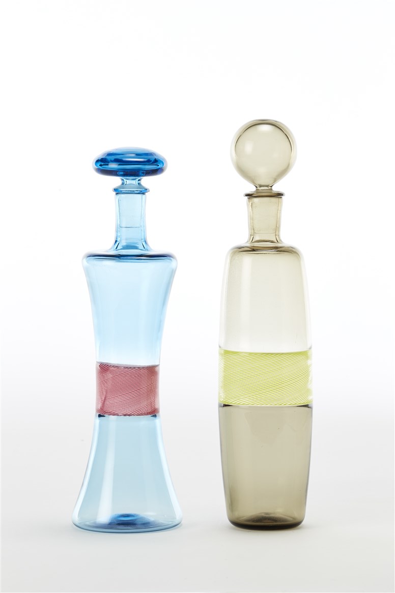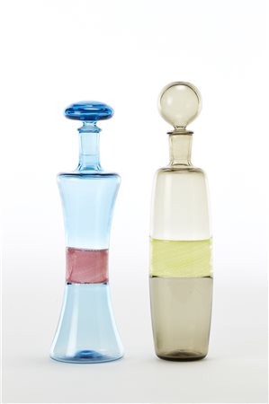 Due bottiglie a doppio incalmo e fascia a mezza filigrana nello stile di Paolo Venini. Anni '70/'80. Vetro soffiato trasparente azzurrino, ambrato con mezza filigrana ametista-lattimo e giallo. (h cm 34, h cm 31)