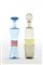 Due bottiglie a doppio incalmo e fascia a mezza filigrana nello stile di Paolo Venini. A70-80. Vetro soffiato trasparente azzurrino, ambrato con mezza filigrana ametista-lattimo e giallo. (h cm 34, h cm 31)