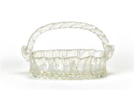 Cestino in vetro cristallo opalescente fortemente iridato. Murano, anni '40. (cm 29,5x27x16)