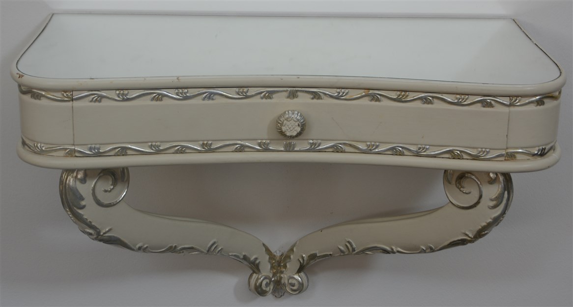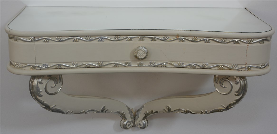 Coppia di comodini pensili a mensola in legno d’acero intagliato a racemi verniciato bianco e argento ad un cassetto sottopiano. Piano rivestito in vetro a specchio. Anni '40. (cm 71x40x31,5) (lievi difetti e restauri)