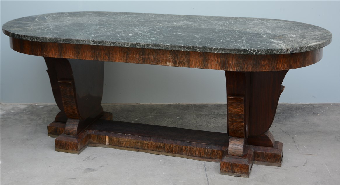 Tavolo da pranzo dèco in legno placcato in palissandro indiano e zebrano. Piano in marmo verde venato, base contornata in ottone. Italia, anni '20. (cm 200x79x94,5) (difetti)
