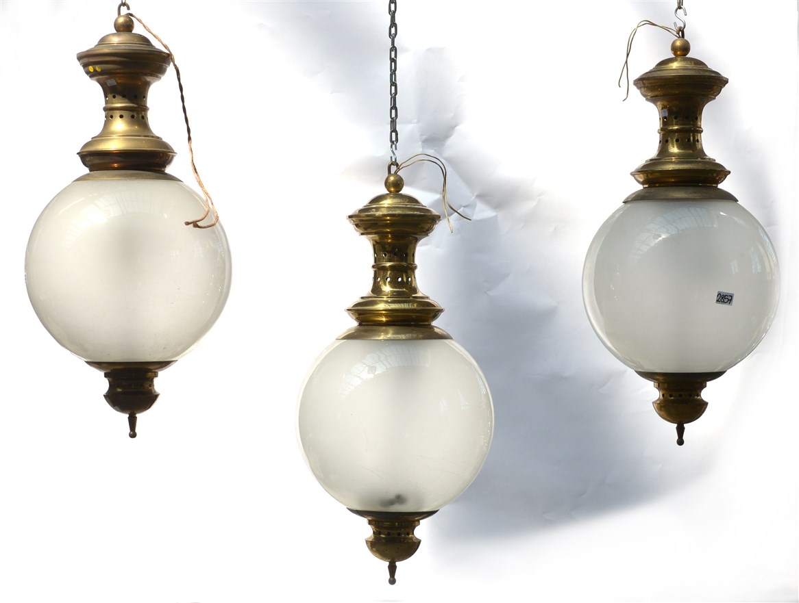 Tre lampade modello "LS1GC lampione". Produzione Azucena, Milano, 1954. Ottone e vetro soffiato satinato sulla superficie interna. (lievi difetti)