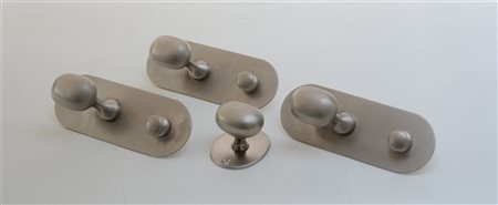 Lotto di tre appendiabiti modello "Super" unito ad un appendiabiti a singolo pomolo di analoga fattura. Produzione Azucena, Milano, 1962. Ottone nichelato e satinato. (cm 20x7x7,5) (lievi difetti e restauri)