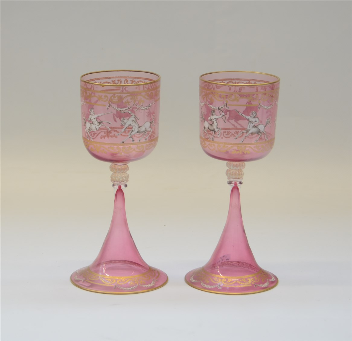 Coppia di bicchieri in vetro trasparente ametista chiarissimo con motivi in oro zecchino e decorati a mano con scene di battaglia di centauri. Anni '50. (h cm 20)