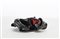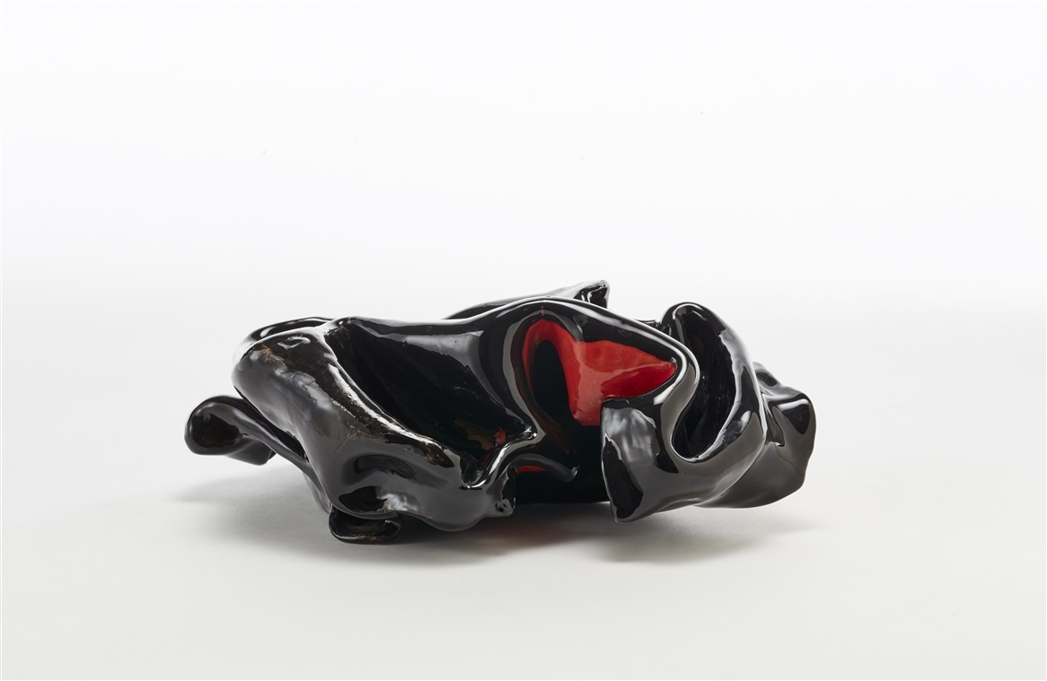 Scultura in ceramica a forma di cartoccio, smaltata in nero e rosso. Italia, es