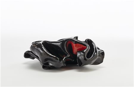 Scultura in ceramica a forma di cartoccio, smaltata in nero e rosso. Italia, esecuzione recente. (cm 28x10x18,5) (lievi difetti)