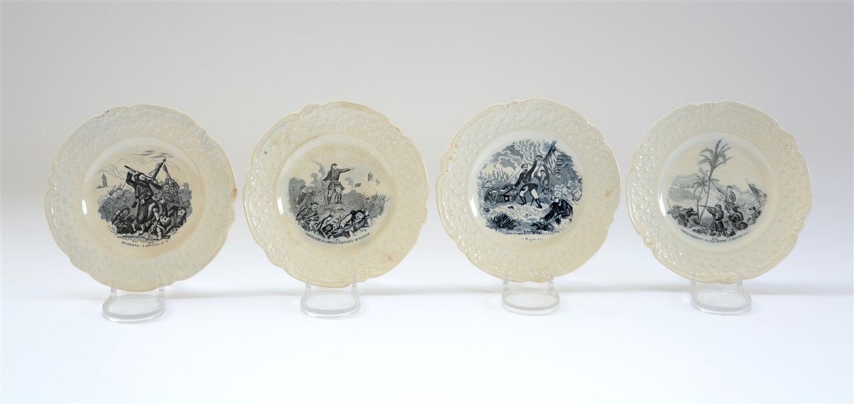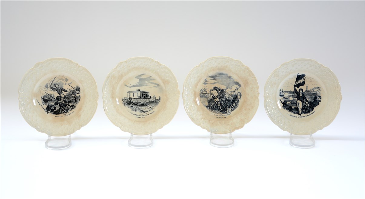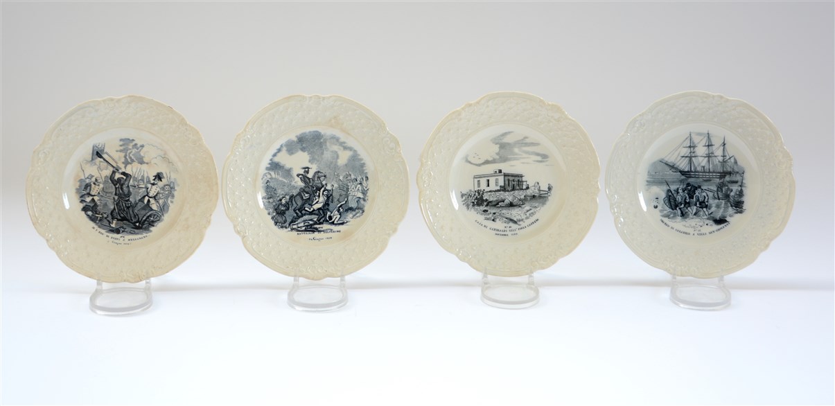Interessante serie di dodici piatti in ceramica smaltata bianca con all'interno stampa monocromica riproducente fatti d'arme del risorgimento.