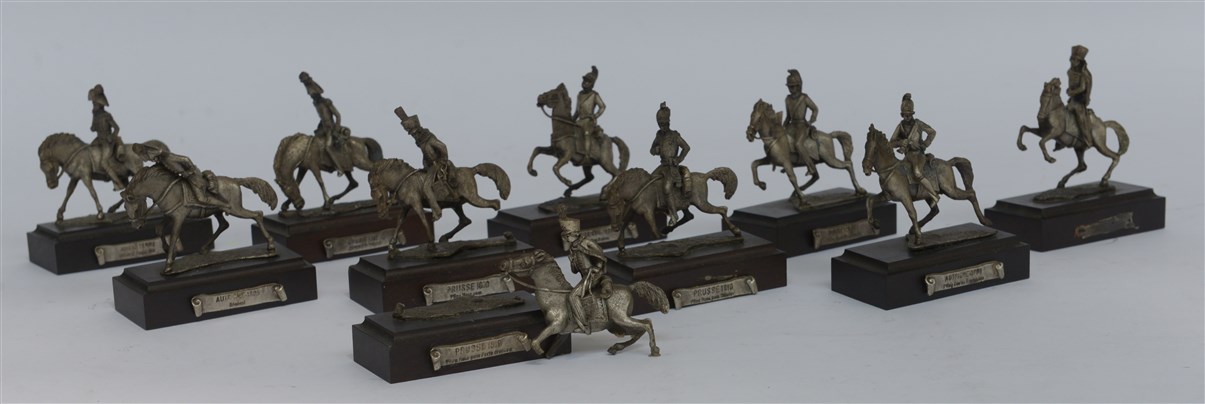 Lotto di dieci soldatini a cavallo in metallo argentato e cesellato inerenti al periodo napoleonico composto da quattro soldati austriaci, quattro prussiani e due inglesi su basamento di legno ebenizzato e cartiglio di identificazione.