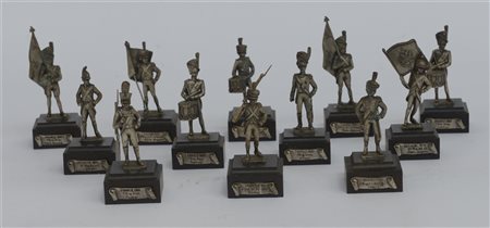 Lotto di dodici soldatini di fanteria in metallo argentato e cesellato inerenti al periodo napoleonico composto da dieci soldati francesi e due austriaci su basamento di legno ebanizzato e cartiglio di identificazione.
