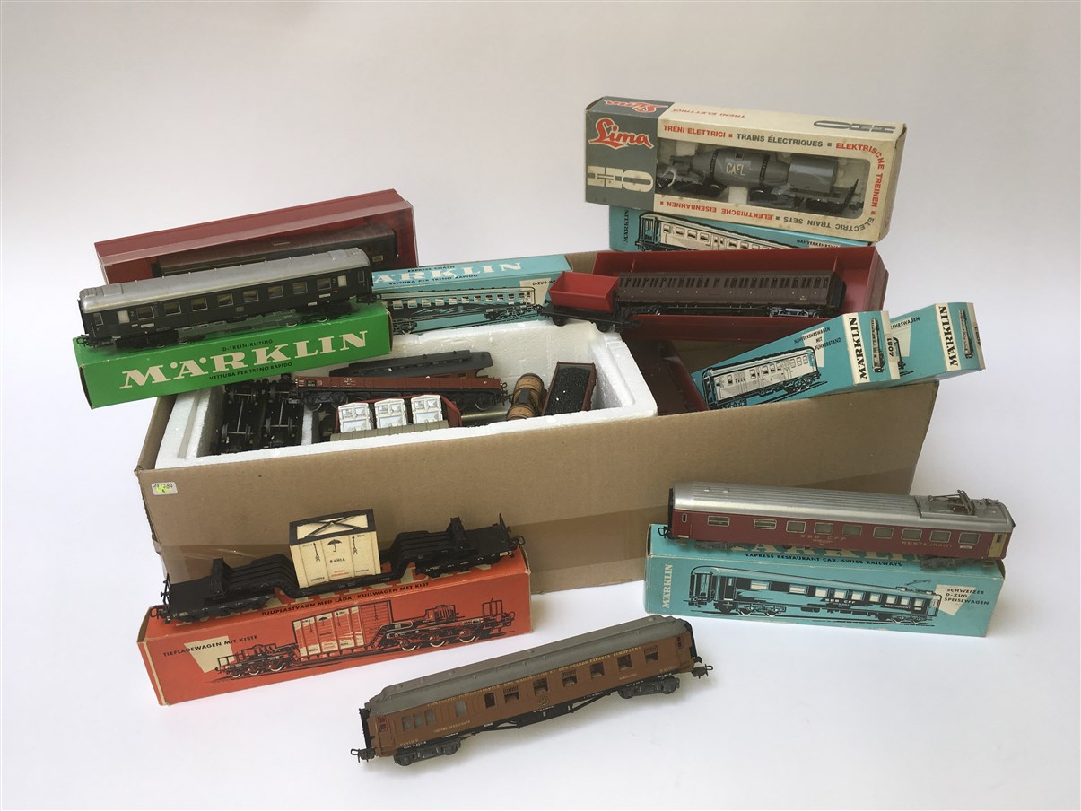 Cartone contenente numerose carrozze e alcuni vagoni merci per modellismo ferroviario, marcati Märklin e Rivarossi (difetti)