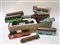 Cartone contenente numerose carrozze e alcuni vagoni merci per modellismo ferro