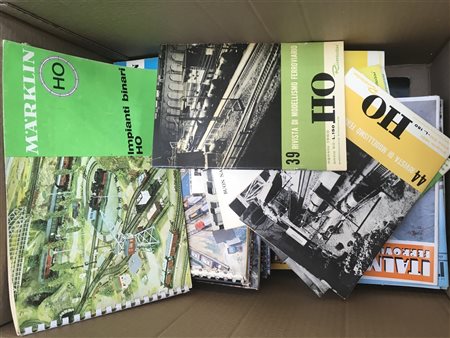 Cartone contenente numerose pubblicazioni (riviste e cataloghi) per modellismo ferroviario (difetti)
