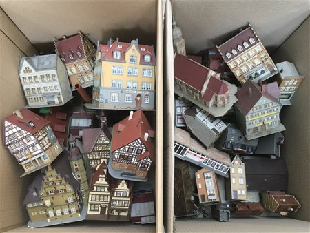 Lotto di due cartoni contenenti numerosi edifici per modellismo ferroviario mar