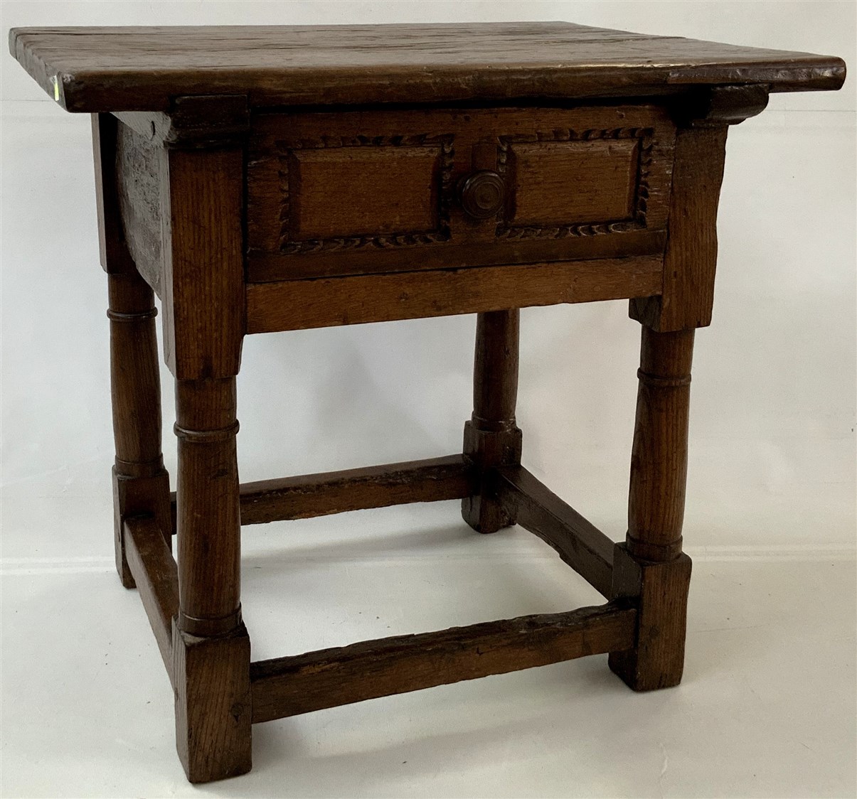 Tavolino ad un cassetto con gambe a rocchetto riunite da traversa. Secolo XVII (cm 70x63x53) (difetti e restauri)