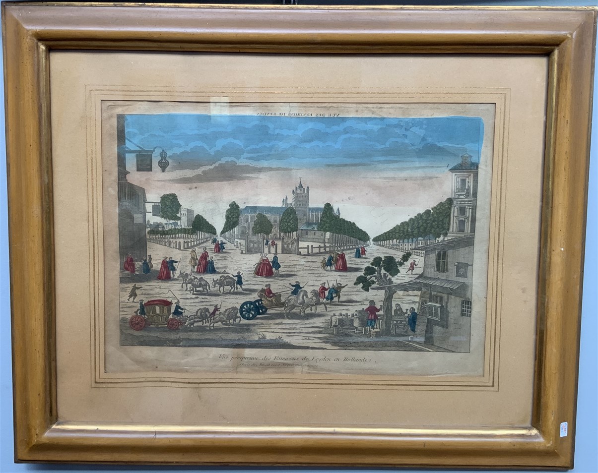 Incisione acquarellata dal secolo XVIII raffigurante veduta prospettica dei dintorni di Leyden (cm 30x42) in cornice (difetti)