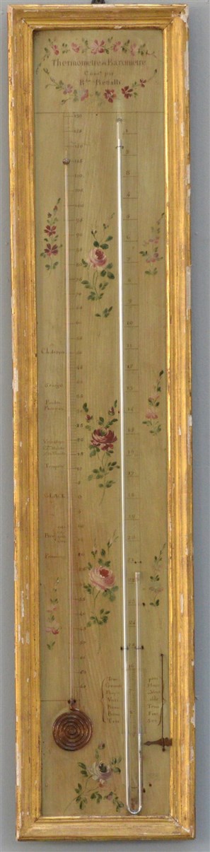 B. Bettalli, barometro/trermometro con pannello in legno dipinto in policromia a fiori, in cornici (cm 106x23) (difetti e mancanze)