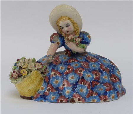 Manifattura del secolo XX "Bambina con fiori" scultura in ceramica policroma. (h cm 21)