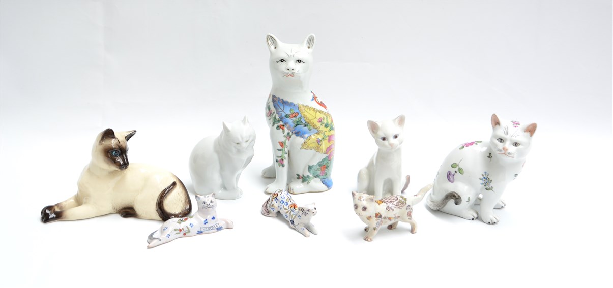 Gruppo di otto gatti in porcellana dipinta raffiguranti gatti, manifatture differenti (h max cm 21) (lievi difetti)