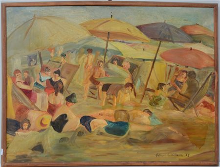 Firma indecifrata "Spiaggia" olio su compensato cm 60x80 Firmato e datato '58 i