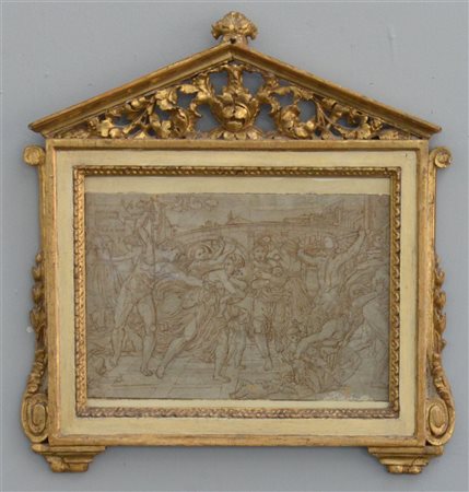 Ignoto, da Raffaello, "Strage degli innocenti" penna e inchiostro bruno su carta incollata su tela (mm 240x350) in cornice a tempietto in legno dorato, laccato e intagliato del secolo XIX (difetti)