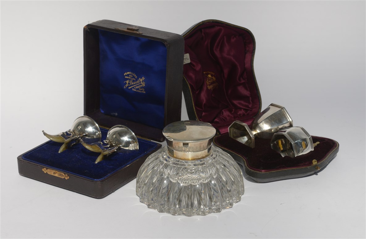 Lotto composto da un calamaio in cristallo con tappo celante orologio in argento, un bicchierino e un portatovaglioli e due salierine contenute in custodia originale. Secolo XX (difetti)